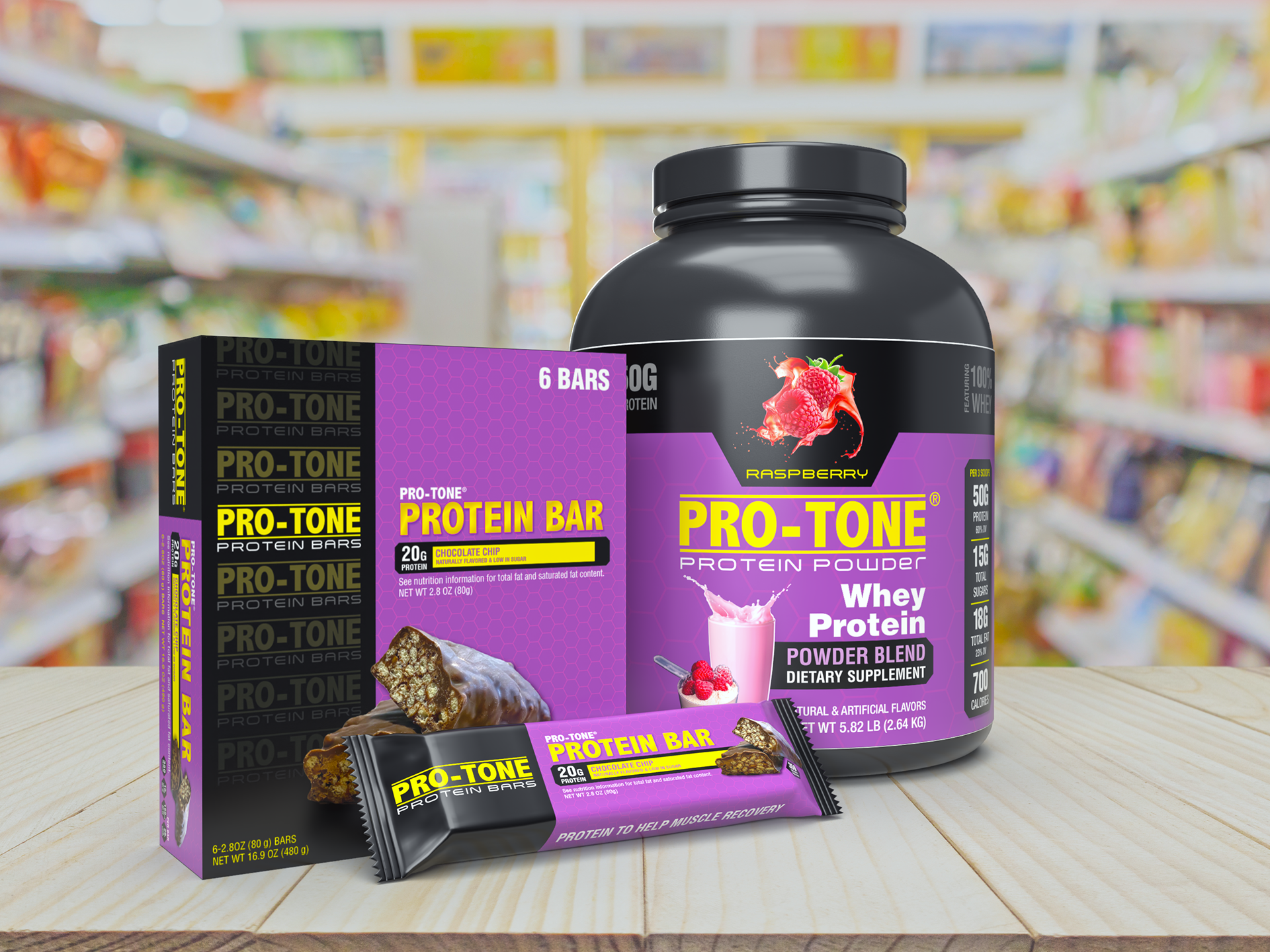 Pro-Tone Protein Products. Created as a speculative product-line design to showcase branding conceptualization and consistency across a suite of products. 3D models were stock, dressed up in Adobe Dimension. Packaging/labeling designed in Adobe Illustrator, Photoshop and InDesign, employing some stock imagery. The photo of the chocolate protein/nut bar was taken with my iPhone.